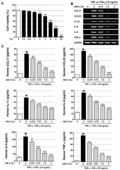 First, the effects of HM-V on cell viability were evaluated. As shown in Figure 1, HaCaTs were treated with the indicated concentrations of HM-V. Approximately 80% of the cells treated with 3% HM-V survived for over 24 h. Therefore, up to 3% HM-V was used for the in vitro experiments. Next, the mRNA expression levels of the pro-inflammatory cytokines (IL-6, IL-1β, IL-8, TNF-α, CCL17, and CCL22) in the TNF-α/IFN-γ-induced HaCaTs were measured to evaluate the effects of HM-V. At a concentration of 3%, HM-V strongly inhibited the mRNA expression of various TNF-α/IFN-γ-induced pro-inflammatory cytokines in a concentration-dependent manner. However, IL-1β mRNA showed slightly weaker expression than other mRNAs. Next, the effects of HM-V on pro-inflammatory cytokine production in TNF-α/IFN-γ-stimulated keratinocytes were investigated. The production of pro-inflammatory cytokines was compared using ELISA. Stimulation with TNF-α/IFN-γ led to an increase of 40–180 pg/mL depending on the type of cytokine. The basal control levels were approximately 7–40 pg/mL.
