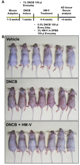 The animal experiments were approved by the Institutional Animal Care and Use Committee at Kyung Hee University (KHGASP-20-172). Male BALB/c nude mice (6 weeks of age) were obtained from Orient Bio. Inc. (Sungnam, Korea). All mice were cared for at the animal facility of Kyung Hee University (Yongin, Korea). The mice were housed in a controlled environment with a 12-h light/12-h dark cycles and free access to food and water. The room temperature was maintained at 22 ± 1 °C with 50 ± 10% humidity. DNCB (Sigma-Aldrich, St. Louis, MO, USA) was dissolved in a working solution (3:1 acetone: olive oil) and used as a sensitizer to induce atopic dermatitis-like skin lesions in mice. The mice were divided into three groups with six or seven mice per group as follows: vehicle, DNCB, and DNCB plus topical treatments with 3% HM-V. As shown in Figure 2, the nude mice were treated for 1 week with 1% DNCB (100 μL), that caused contact dermatitis. Next, 3% HM-V solution in PBS (100 μL) was administered daily for 6 weeks and 0.5% DNCB was administered once every 2 days for the same period.