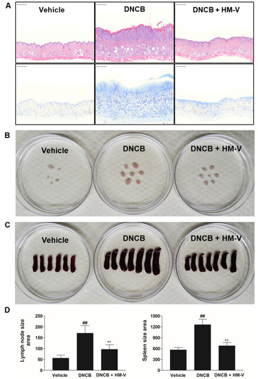 Symptoms of atopic dermatitis are often accompanied by enlarged local lymph nodes. The spleen also increases in size due to cell-mediated reactions, including both T and B cell activation [19]. Therefore, the effects of HM-V were confirmed using morphological analysis of epidermal thickness, local lymph nodes, and spleen (Figure 3). The size of local lymph nodes and spleen increased in the positive control group treated with DNCB compared with the negative control group without DNCB. In addition, the size of local lymph nodes and spleen were significantly reduced in the test group treated with 3% HM-V compared with the positive group. DNCB induces keratosis, which is caused by the abnormal differentiation of skin tissue due to inflammation. Keratosis results in abnormal proliferation of the epidermis. The present study results demonstrated a substantial reduction in the epidermis thickness in the HM-V-treated group. Furthermore, 3% HM-V inhibited eosinophil and mast cell infiltration based on H&E and Toluidine Blue O staining assays.