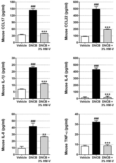 Effects of HM-V on serum pro-inflammatory cytokines and chemokines in DNCB-induced mice. Serum was collected 24 h after final HM-V and/or DNCB sensitization. Pro-inflammatory cytokines and chemokines were analyzed using ELISA. Vehicle, negative control; DNCB, DNCB-induced mice (positive control); DNCB+3% HM-V, DNCB plus 3% HM-V. Data shown are the average of six or seven samples per group and shown as the means ± SD. ### p < 0.001 versus negative control, ** p < 0.01, and *** p < 0.001 versus positive control.