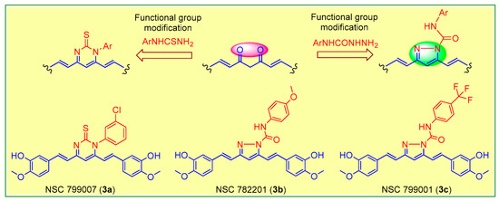 Molecular engineering of curcumin to pyrimidine thione (3a), and pyrazoles (3b,c) counterparts.