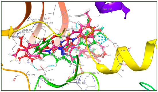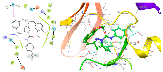 EGFR was chosen for docking studies because it is a potential target for many anticancer drugs, including gefitinib, erlotinib, cetuximab, and panitumumab [49]. Curcumin analogues have also been well studied as anti-EGFR agents [18,28]. The X-ray crystal structure of EGFR with PDB ID: 3W2R was retrieved from protein data bank [41]. The molecular docking score and types of interaction of curcumin analogs (3a–c) are given in Table 1 and binding mode of curcumin analogs are shown in Figure 2. Due to their large structure and high molecular weight, the curcumin analogs fit inside the active site of EGFR and showed various types of interaction including hydrophobic interaction, H-bond, and π–π stacking. The ligand 3a displayed only π–π stacking interaction with the amino acids Asp855, Asp800, and Leu718, while ligand 3b displayed two H-bond with the residues Leu718 and Asp800 and two π–π stacking with the residues Leu718 and Asp800 as showed in Figure 3. The ligand 3c displayed significant interaction within the active site of EGFR having three H-bonds with the residues Met793, Gln791, and Ser720, while three π–π stacking with the residues Asp855, Asp800, and Leu718 as shown in Figure 4.