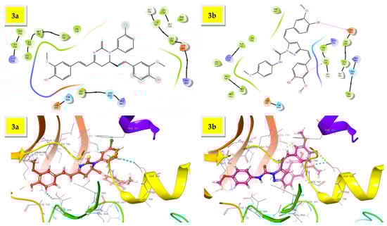 Cancer is one of the most dreadful diseases and the leading cause of death today, with nearly 10 million deaths and 19.3 million new cases expected in 2020 [29]. Chemotherapy is the most commonly used method of cancer treatment, but it is always associated with a number of toxic side effects. As a result, we became more reliant on nature, because active constituents of natural origin are assumed to be safe. In some studies, curcumin analogs were also discovered to be an inhibitor of EGFR, one of the primary targets of many anticancer drugs [18,28]. Furthermore, many of the cancer cell lines, including breast (MDA-MB-231, MCF7, HS 578T, BT-549, T-47D MDA-MB-468, and MDA-MB-468), colon (HCT-116, HT-29, COLO 205, HCT 116, HT29, and SW620), non-small cell lung (A549, NCI-H460, and NCI-H322), renal (786-O), melanoma (SKMEL28), ovarian (SKOV3), and prostate (PC3) cancer cell lines, have been found to express varying levels of EGFR [30,31,32,33,34,35,36]. Inspired by their impressive biological activities, we reported herein the molecular docking, antiproliferative potential, and anti-EGFR activity of some of the prepared curcumin analogs (3a,b). In silico molecular docking analysis was carried out against EGFR through the Schrodinger’s software. As molecular docking is now an integral part of computer-aided drug design (CADD), in which ligands with computed generated 3D structures are positioned into a receptor or biological target in a variety of orientations, conformations, and positions [37], it has numerous uses and applications in drug discovery, including structure–activity studies, lead optimization, and virtual screening to find potential leads [38]. Indeed, molecular docking has been used for more than three decades, and it has resulted in the discovery and development of a large number of new drugs [39].