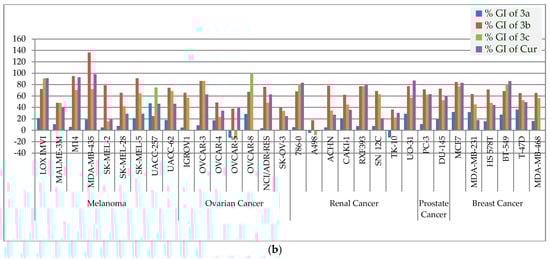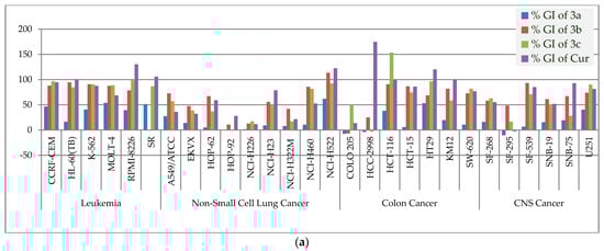 (a). The % GIs of curcumin analogs (3a–c) and curcumin (Cur) on leukemia, non-small cell lung, colon, and CNS cancer panels. (b). The % GIs of curcumin analogs (3a–c) and curcumin (Cur) on melanoma, ovarian, renal, prostate, and breast cancer panels.