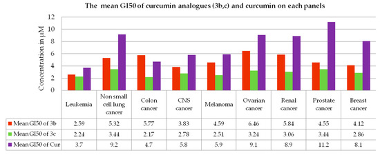 The mean GI50 of curcumin analogs (3b,c) and curcumin (Cur) on each panel of cancer cell lines in the five-dose assay.