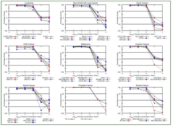 The antiproliferative activity of tested compounds was done against five dozen (60) cancer cell lines derived from nine different panels. All of the compounds were evaluated for antiproliferative activity in a single dose at 10 µM. Growth percent (GP) and percent growth inhibition (% GI) were used to calculate antiproliferative activity. The tested compounds that demonstrated significant activity were subjected to a five-dose assay (0.01 to 100 µM). The antiproliferative results of five-dose assay were calculated as three dose related parameters like, 50% growth inhibition (GI50), 50% lethal concentration (LC50), and total growth inhibition TGI [43,44,45,46,47].