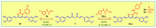 The isolated curcumin was used as a starting compound for the preparation of curcumin analogues via chemical modification of curcumin according to the methods described [18,19]. Figure 1 depicts the chemical modification curcumin and curcumin analogues. An equimolar amount of curcumin (1) (0.25 mmol; 92 mg) and 3-chlorophenyl thiourea (2a) (0.25 mmol; 46 mg) in glacial acetic acid in 50 mL round-bottom flask placed in sand bath was heated at 80 °C with continuous stirring on magnetic stirrer for 10 h to obtain the compound 3a, while an equimolar amount of curcumin (1) (0.25 mmol; 92 mg) and N-(4-substitutedphenyl)hydrazine carboxamides (2b,c) (0.25 mmol) in glacial acetic acid in 50 mL round-bottom flask placed in sand bath was heated at 80 °C with continuous stirring for 8–10 h on magnetic stirrer to obtain the compound 3b,c. The completion of reaction was monitored throughout by thin layer chromatography using mobile phase, n-hexane: ethylacetate (6:4). The excess of solvent was removed under vacuum distillation. Cooled the reaction mixture to room temperature and poured into the crushed ice to obtain the crude product, filtered, and dried. The crude products were further re-crystallization with ethanol to obtain the compounds, 3a–c. The synthetic route followed is shown in Scheme 1.
