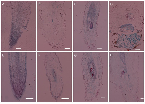 Tissue section to observe the disease resistance response of PsoRPM3 transgenic tobacco after nematode inoculation. The paraffin section technique was used to observe the nematode invasion status of tobacco roots infected by M. incognita, and to compare the difference in disease resistance between the transgenic and wild-type tobacco W38. (A–D) The observation of wild-type tobacco W38 roots which were inoculated with M. incognita at 0 d, 3 d, 14 d and 30 d as a negative control; (E–H) The observation of transgenic PsoRPM3 tobacco roots which were inoculated with M. incognita at 0 d, 3 d, 14 d and 30 d; scale bar is 100 μm.