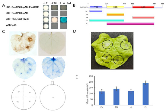 ROS (Reactive oxygen species) burst detection and cell death staining in the PsoRPM3 disease resistance response. (A) Analysis of interactions between PsoRPM3 and PsoRPM3 using the yeast two-hybrid system. α-Galactosidase activity was detected using X-α-Gal as a substrate. (B) Segmentation pattern of the structural domain of PsoRPM3 protein. (C) The brown color is DAB for reactive oxygen species staining in HR reaction, and the blue color is trypan blue for cell necrosis staining. (D) HR responses observed in tobacco (N. benthamiana) leaves transiently overexpressing empty vector, TN, NL, and FL 1 d after inoculation with M. incognita. (E) Determination of cell necrosis area to (D).