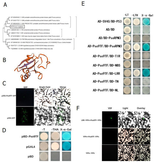 The above studies have shown that PsoRPM3 protein could activate the production of ROS and induce HR responses, for which the components downstream of the disease resistance signal were not clear. We screened a number of complexes bound to PsoRPM3 protein in Xinjiang wild myrobalan plum (P. sogdiana) by CO-IP based on its localization in the nucleus, including a transcription factor Pso9TF. We cloned the Pso9TF gene from P. sogdiana. The phylogenetic tree analysis revealed that Pso9TF was a basic leucine zipper transcription factor or kinase (Figure 3A), and its protein structure contained the PB1 structural domain (Figure 3B). The subcellular localization result showed that Pso9TF was localized in the nucleus (Figure 3C). The transcriptional self-activation assay revealed found Pso9TF has transcriptional self-activation activity (Figure 3D). Further, yeast two-hybrid assays showed that there was an interaction between Pso9TF and the full-length (FL) and LRR structural domains of the PsoRPM3 protein, but not with the TIR, NBS, TN and NL structural domains (Figure 3E). Their relationships were also verified by BiFC assays (Figure 3F).