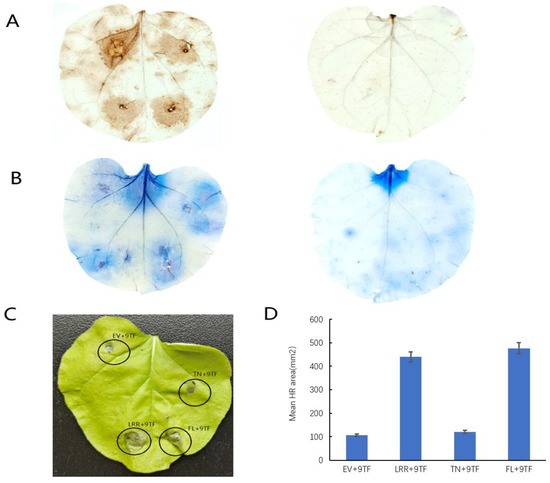 Effect of Pso9TF on PsoRPM3 disease resistance. (A) Pso9TF and GFP empty vectors, Pso9TF and TN, Pso9TF and LRR, Pso9TF and FL were transiently co-expressed on tobacco leaves of N. benthamian, and then injected into nematodes after 1 d, and then stained with DAB for reactive oxygen species. (B) Samples stained with trypan blue for necrotic cells; the left was the test group, the right was the control group. (C) HR reaction observed directly without any dyeing treatment. (D) Measurement and counting of the area of the HR response.
