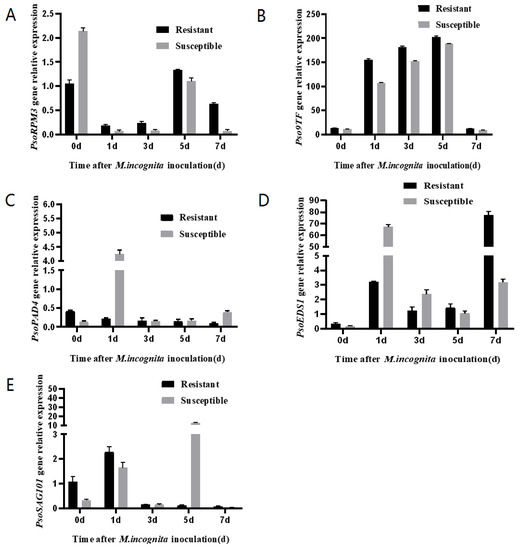 Expression of PsoRPM3, Pso9TF, PsoPAD4, PsoEDS1 and PsoSAG101 genes was analyzed using roots of Xinjiang wild myrobalan plum cuttings after inoculation with M. incognita. The results showed that the expression of the PsoRPM3 gene increased continuously from 1 to 5 days after inoculation, with the highest on the fifth day (Figure 5A); the Pso9TF gene was abundantly expressed in both disease-resistant and susceptible plants from 1 to 5 days after inoculation, but the expression was significantly higher in disease-resistant plants than in susceptible plants, while the expression of Pso9TF gene decreased significantly before and 7 days after inoculation (Figure 5B). Both PsoPAD4 and PsoEDS1 genes strongly expressed in susceptible plants in different time points (Figure 5C,D). The PsoSAG101 gene was only expressed in susceptible plants at 5 days after inoculation and was expressed at low levels in the rest of the period (Figure 5E). In all the tested time points, we found that the expression levels of Pso9TF and PsoRPM3 have shown a similar trend: both genes showed significantly more induction in resistant plants than susceptible plants.