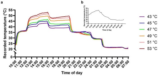 To characterize the effect of heat stress on physiological properties of young ‘Hass’ avocado plants, potted plants were subjected to 43 °C, 45 °C, 47 °C, 49 °C, 51 °C and 53 °C treatments. Although natural field daily temperatures are characterized by a sloped gradient (Figure 1a), the climate chamber could create only stepped temperature gradients (Figure 1b). Still, both natural and artificial temperature gradients were very similar.