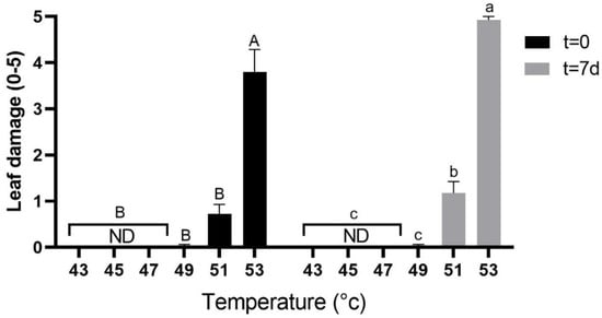 At t = 0, leaf damage was not apparent following the 43 °C, 45 °C and 47 °C treatments (Figure 2 and Figure S1). Minor damage started to show on leaves from plants subjected to the 49 °C and 51 °C treatments. Plants subjected to the 53 °C treatment showed significantly greater damage. Similar trends and leaf damage assessments were seen at t = 7 d.