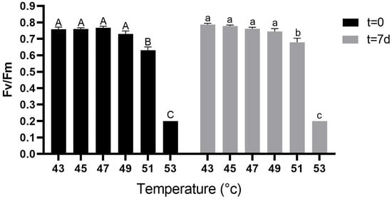 Fv/Fm rates before the heat treatments, at t = −1 d, ranged between 0.77 and 0.81 (Figure S2) and were similar between the plants which were subsequently used for all the different treatments. Fv/Fm values at t = 0 were high in plants subjected to the 43 °C, 45 °C, 47 °C and 49 °C treatments and ranged between 0.73 and 0.77 (Figure 3), significantly higher than for plants subjected to the 51 °C treatment (0.63); the latter value was significantly greater than that of plants subjected to the 53 °C treatment (0.2). Similar trends of Fv/Fm were still evident at t = 7 d (Figure 3).