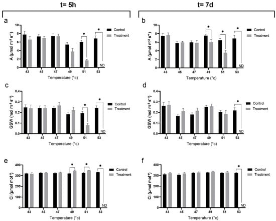 At both time points, substomatal internal CO2 concentration (Ci) in the control plants was slightly above 300 µmol mol−1. At t = 5 h, Ci increased significantly in plants subjected to the 49 °C and 51 °C treatments, as compared to the control plants, whereas in plants subjected to the 53 °C treatment, there was no assimilation and Ci was not detected (Figure 4e). At t = 7 d, there was no difference in Ci between the control and any of the heat treatments, except in plants subjected to the 53 °C treatment, where Ci remained undetectable (Figure 4f).