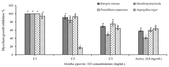 Antifungal activity of M. piperita EO. Where: C1: 5.0 mg/mL; C2: 1.0 mg/mL; C3: 0.1 mg/mL. Bars with different letters for each tested fungus indicate mean values significantly different at p < 0.05 according to two-way ANOVA combined with Duncan post hoc multiple comparison test.