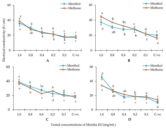 The effect of single constituents of peppermint EO on mycelium electrical conductivity of the tested fungi. Where (A): Monilinia fructicola; (B): Botrytis cinerea; (C): Aspergillus niger; (D): Penicillium expansum. C-ve: negative control (potato dextrose broth). Differences between the tested concentrations for each tested fungus indicate mean values significantly different at p < 0.05 according to one-way ANOVA for each fungus combined with Duncan post hoc multiple comparison test.