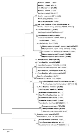 From the 62 isolates, 32 were obtained from wild plants, whereas the other 29 from the cultivated ones. Random Amplified Polymorphic DNA (RAPD) profiles were obtained for all the 62 isolates and grouped in 50 different clusters. Most of the RAPD profiles (39) were unique. Eight clusters were formed by two isolates while the other three by three or more isolates. Isolates selected for 16S rRNA gene amplification and sequencing were identified belonging to five genera (Bacillus, Paenibacillus, Pseudomonas, Sphingomonas and Staphylococcus) and 17 bacteria species (Figure 1, Table S2).
