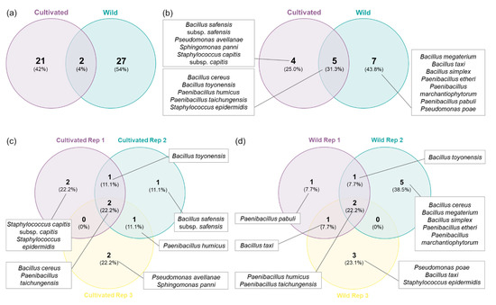 Venn diagrams with the number of RAPD profiles and bacteria species: (a) RAPD profiles from orchard and wild plants; (b) endophytic bacteria species from orchard and wild plants; (c) endophytic bacteria species from cultivated plant replicates; (d) endophytic bacteria species from wild plant replicates.