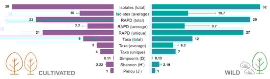 Venn diagrams of the RAPD profiles and bacteria species from cropped and wild plants were constructed in R software version 4.0.3 [67], using the package VennDiagram [68]. The Shannon index (H’), Simpson (D), Simpson reciprocal index (1-D’) and Pielou index (J’) were obtained to compare the diversity between populations. Diversity indexes were compared by a t-student test, whereas antagonism and IAA production data were analysed by one-way ANOVA using GraphPad Prism (v. 8.4.3 for Windows, San Diego, CA, USA), followed by a Tukey’s multiple comparison test (p < 0.05).