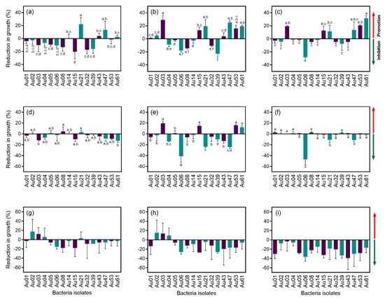Antagonism assay between some of the endophytic bacteria isolated from Arbutus unedo and the plant pathogens Glomerella cingulata, Mycosphaerella aurantia and Phytophthora cinnamomi. Reduction in growth (%) was calculated after 1, 2 and 3 weeks for G. cingulata and P. cinnamomi, and after 3, 6 and 9 weeks for M. aurantia. (a) G. cingulata after 1 week; (b) G. cingulata after 2 weeks; (c) G. cingulata after 3 weeks; (d) M. aurantia after 3 weeks; (e) M. aurantia after 6 weeks; (f) M. aurantia after 9 weeks; (g) P. cinnamomi after 1 week; (h) P. cinnamomi after 2 weeks; (i) Phytophthora cinnamomi after 3 weeks. Bacteria isolates: Au01—Pseudomonas avellanae; Au02—Bacillus toyonensis; Au03—Paenibacillus humicus; Au04—Bacillus megaterium; Au05—Bacillus toyonensis; Au06—Bacillus cereus; Au08—Bacillus toyonensis; Au14—Bacillus safensis; Au15—Paenibacillus pabuli; Au21—Bacillus simplex; Au32—Paenibacillus marchantiophytorum; Au39—Pseudomonas poae; Au43—Sphingomonas panni; Au47—Paenibacillus etheri; Au53—Paenibacillus taichungensis; and Au61—Bacillus taxi. Means ± standard deviations, n = 3; different letters indicate significant differences between treatments (p ≤ 0.05).