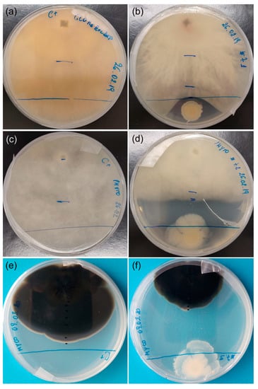 Antagonism test between Bacillus cereus (Au06) and Glomerella cingulata, Phytophthora cinnamomi and Mycosphaerella aurantia. (a) G. cingulata (3 weeks); (b) G. cingulata and B. cereus (3 weeks); (c) P. cinnamomi (3 weeks); (d) P. cinnamomi and B. cereus (3 weeks); (e) M. aurantia (9 weeks); (f) M. aurantia and B. cereus (9 weeks).
