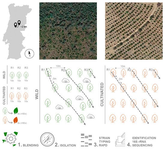 Plant material was collected during May 2018 from 30 A. unedo trees growing in the wild (40.043334, −7.904996) and 30 in an orchard (40.029581, −7.924739), in Pampilhosa da Serra, Coimbra district, central Portugal. The distance between the groups is approximately 2 km. Trees were 5 m apart on a 750 m2 area (50 m × 15 m). Three replicates from each location were used, each replicate consisting of 10 healthy adult trees (i.e., without any disease symptoms). Five leaves without any visible symptoms were randomly collected from each tree (a total of 50 leaves per replicate) and pooled together (Figure 6). Leaves were stored in sterile plastic bags at 4 °C and processed within 24 h. Plants from the wild location were growing under uncontrolled conditions, in a mixed forest with Pinus pinaster and shrubs (Erica arborea, Calluna vulgaris and Ulex spp.) as well as several weeds. In the orchard, an irrigation system was installed, plants were regularly pruned and fertilized, and the soil had been mobilized to remove weed species.