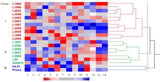 Hierarchical cluster analysis dendrogram (Ward’s method) and pattern map of the values of the agronomic and qualitative traits of 20 barley genotypes. Abbreviations for graph: 1, days to heading from April 1; 2, plant height (cm); 3, seed yield (t ha−1); 4, specific weight (kg hL−1); 5, 1000−seed weight (g); 6, total proteins (%); 7, total carotenoids (μg β carotene g−1 dry matter); 8, β-glucans (%); 9, total polyphenols (μg gallic acid equivalents (GAE) g−1 dry matter); 10, total proanthocyanidins (μg catechin equivalents (CE) g−1 dry matter); 11, total anthocyanins (μg CE g−1 dry matter); 12, total flavonoids (μg gallic acid g−1 dry matter); 13, DPPH (μmol of Trolox equivalent g−1 dry matter); 14, TEAC (μmol of Trolox equivalent g−1 dry matter).