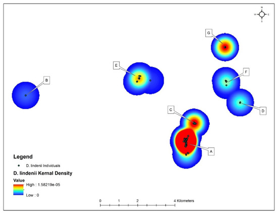 The XToolsPro kernel density tool in ArcGIS Desktop 10.7.1 was used to create Figure 3. For point features marking orchid locations, the program was used to calculate the density of D. lindenii points in a neighborhood around those points. The kernel function was based on the quartic kernel function described in Silverman [32].