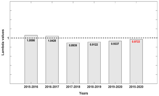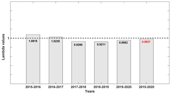 Lambda (λ) values for each pair of years and for the period 2015–2020 for all seven Dendrophylax lindenii populations within the Florida Panther National Wildlife Refuge. Note that the Lambda values (λ) indicate an increase in the first two years followed by a noticeable decrease (λ = 0.8939) in the third year (2017–2018). The figure shows a progression towards recovery during the last three years, but λ remains <1.