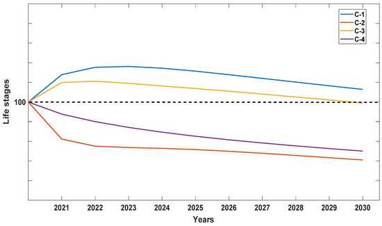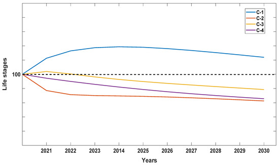 Projection of the behavior between the different orchid life stages (seedlings, juveniles, mature) for the next 10 years for all seven populations in the Florida Panther National Wildlife Refuge. Orchid life stages listed include seedlings (C-1), juveniles (C-2), smaller mature (C-3), and larger mature orchids (C-4). This graph shows that the number of mature plants (C-3, C-4) will decrease.