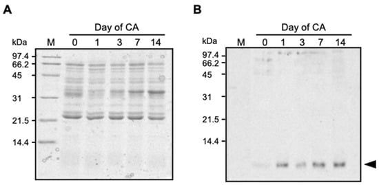 Western blot analysis of cold-acclimated wheat apoplastic protein extracts. (A,B) Apoplastic proteins from a time course of cold treatment were separated by SDS-PAGE (A), and a duplicated gel was transferred to a membrane for Western blot analysis (B). CA, cold acclimation.