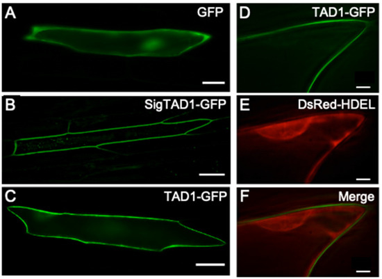 To address the TAD1 localization more in detail, we co-expressed an ER marker, DsRed-HDEL, with TAD1-GFP (Figure 2D,E). DsRed-HDEL showed red fluorescence in a typical ER network, including nuclear and plasma membranes (Figure 2E). A merged image clearly showed that TAD1-GFP fluorescence was detected in the outer layer of the cells, suggesting that the TAD1-GFP protein localizes to the cell wall and apoplast (Figure 2F).