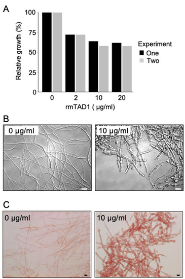 Antifungal activity of TAD1 to snow mold fungus M. nivale. (A) Relative fungus growth was estimated by cultivation of the M. nivale hyphae on a 96-well microplate and increasing the concentration of rmTAD1 (0, 2, 10, and 20 µg/mL) at 10 °C for 9 days. The hyphal growth was monitored by measuring absorbance at 595 nm and was presented as a percentage of the growth in the absence of rmTAD1. Two biological replicate experiments were performed (experiment one and two). (B,C) Microscopic observation of M. nivale hyphae after incubating spores at 10 °C for 9 days with or without rmTAD1 (10 µg/mL). Images of hyphae were captured by using differential interference contrast (DIC) microscopy (B). Mycelia were stained with Congo red (C). Scale bar = 20 µm.