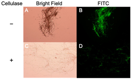 In some bacteria, EPS are involved in the protection against chemical and biological attacks [9,10]. Consequently, we therefore tested the possibility that EPS produced by M. nivale has a protective role against the plant defense system. To address the interaction between TAD1 and EPS, we labeled rmTAD1 with fluorescein isothiocyanate (FITC). Functionality of the rmTAD1-FITC protein was confirmed by observing growth inhibition and EPS production in M. nivale (Figure 4A). Fluorescent images of rmTAD1-FITC demonstrated that rmTAD1-FITC accumulated to a high level within the EPS layer (Figure 4B). Subsequent treatment with 2% cellulase decreased the levels of EPS around the hyphae (Figure 4C) and concomitantly diminished fluorescence signals (Figure 4D). These data suggested that the EPS exhibits some affinity to TAD1. This observation supported a putative function of EPS produced by M. nivale in the protection from the host plant defense system.
