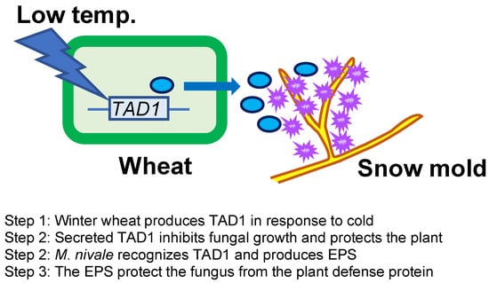 Here, we report that the TAD1 protein accumulates in apoplasts of wheat leaf tissue during cold acclimation and suggest its involvement in cold-induced resistance against snow molds. We found that M. nivale secretes extracellular polysaccharides in response to TAD1 treatment, providing functional evidence for the existence of a defense mechanism of the pathogen against host defense systems.