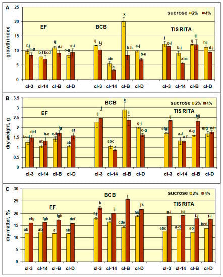 Growth index (A), dry weight (B), and percentage of dry matter (C) of Gentiana dinarica hairy root clones cl-3, cl-14, cl-B, and cl-D, after 7 weeks of cultivation in Erlenmeyer flasks (EF), bubble column bioreactor (BCB), and temporary immersion systems (TIS) RITA®. Presented values are mean ± SE of 3–6 replicates. Within each parameter, values with the same letter are not significantly different at the p ≤ 0.05 level according to Fisher’s least significant difference (LSD) test.