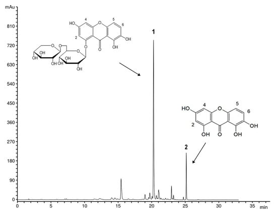 HPLC profile (λ = 260 nm) typical for methanol extract of G. dinarica hairy root clones with chemical structures of the main xanthones norswertianin-1-O-primeveroside (peak 1) and norswertianin (peak 2).