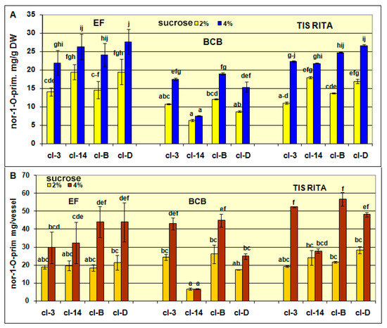 Hairy roots of cl-14 produced the lowest amount of both xanthones compared to the other clones (Figure 4A and Figure 5A). The clones cl-3, cl-B, cl-D produced more nor-1-O-prim in EF and TIS RITA® bioreactors than in BCB (Figure 4A). Nevertheless, due to the high hairy root biomass production in BCB, the differences in the amounts of nor-1-O-prim produced per vessel were statistically insignificant regardless of bioreactor used (Figure 4B). It is evident that increasing sucrose concentration from 2% to 4% stimulated nor-1-O-prim production for approximately 35–50% in well growing clones (cl-3, cl-B and cl-D), while in slow growing cl-14 this increase ranged from 16–26% depending on bioreactor type. Generally, the highest level of nor-1-O-prim was recorded in hairy root clones cultivated at 4% sucrose in bioreactors with higher aeration (BCB and TIS RITA®). Thus cl-B grown in TIS RITA® contained the highest amount of nor-1-O-prim (56.82 mg per vessel), while the satisfactory yield of this xanthone was also recorded in cl-3 grown in the same type of bioreactor (52.46 mg per vessel).