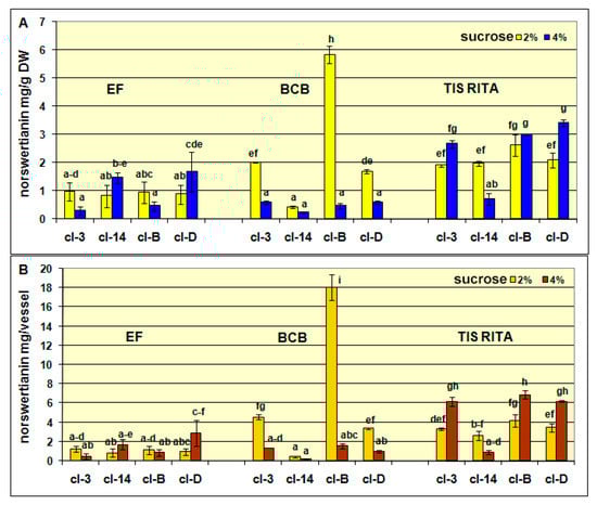 The content of norswertianin in hairy root clones cl-3, cl-14, cl-B, and cl-D, after 7 weeks of cultivation in Erlenmeyer flasks (EF), bubble column bioreactor (BCB) and temporary immersion systems (TIS) RITA®. (A) The contents are presented as mg/g of dry weight and (B) the contents are presented as mg per vessel (bioreactor). Values are expressed as mean ± SE (n = 3–5). The different letters above bars denote significant difference by Fisher’s least significant difference (LSD) test, p ≤ 0.05.