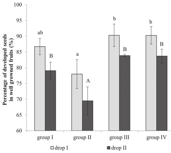 The percentage of developed seeds in fruits of various apple tree cultivars, grouped according to yield self-regulation habit. A 3-year average is presented. Bars indicate standard error of mean. Different letters indicate statistically significant differences: a,b: drop I; A, B: drop II (p ≤ 0.05).