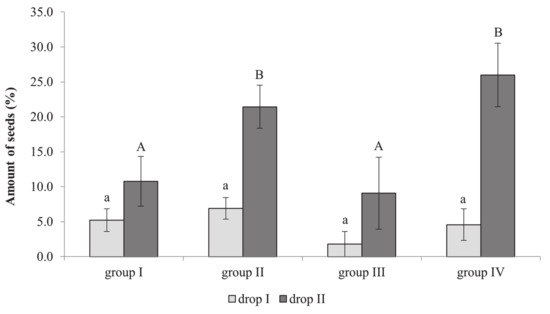 The percentage of developed seeds in eliminated immature fruits of various apple tree cultivars grouped according to their yield self-regulation habit. A 3-year average is presented. Bars indicate standard error of mean. Different letters indicate statistically significant differences: a, b: drop I; A, B: drop II (p ≤ 0.05).