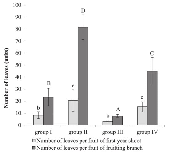 The number of leaves per fruit varied between the groups of cultivars in the first-year shoots from 3.1 (group III) to 20.4 (group II), on average (Figure 3). The lowest number of leaves per fruit was observed in cultivars that tend to self-eliminate a large number of fruitlets, 8.3 in group I and 3.1 in group III. Therefore, cultivars self-eliminating a lower number of fruits, groups II and IV, had a significantly higher number of leaves on first-year shoots per fruit: 20.4 and 15.3, respectively. A similar ratio trend was observed in leaves on fruiting branches, where groups I and III had fewer leaves per fruit, 23.4 and 7.6, respectively, compared to 81.5 and 44.8 in groups II and IV, respectively.
