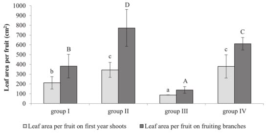 Leaf assimilation area was measured both on first year shoots and fruiting branches. We found that, on average, leaf area on the first-year shoot per fruit ranged from 87.5 cm2 (group III) to 379.2 cm2 (group IV) (Figure 4). Leaf area on the first-year shoot per fruit in cultivar groups I and III ranged from 87.5–211.7 cm2 and was significantly lower than in cultivars from groups II and IV (343.8 and 379.2 cm2, respectively). Fruiting branches, on average, had double the leaf assimilation area per fruit, which ranged from 138.9 to 773.1 cm2; however, the tendency was similar to that observed in first-year shoots. The leaf area on fruiting branches per fruit was significantly lower in groups I and III than in groups II and IV and ranged from 138.9–382.2 to 610.9–773.1 cm2, respectively.