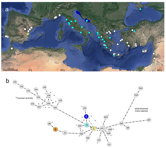 - Falchi, A.; Paolini, J.; Desjobert, J.-M.; Melis, A.; Costa, B.; Varesi, L. Phylogeography of Cistus creticus L. on Corsica and Sardinia inferred by the TRNL-F and RPL32-TRNL sequences of cpDNA. Mol. Phylogenet. Evol. 2009, 52, 538–543. [Google Scholar] [CrossRef]
