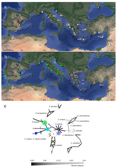 Geographical distribution of ribotypes A and F (and rare variants; (a)) and ribotypes B, C, D and E (and their rare variants; (b)). For a clearer presentation, the overlapping distribution of ribotype A and ribotypes B, C, D and E was illustrated on two separate figures. Squares represent populations of C. albidus, circles populations of C. creticus (usually two individual plants each). Colours of squares and circles point to the six main ribotypes (and their variants) or indicate missing data (dark grey). Rare variants were identified according to the numbering in Table 3. (c) Minimum spanning network based on the extended ITS sequence alignment (Prevosti’s absolute genetic distance). Coloured circles represent the ribotypes of the C. creticus–C. albidus complex detected during this investigation (circle colours reflect those used in Figure 3a,b to display ribotype distribution). Grey circles represent ribotypes of different Cistus species or ribotypes based on GenBank sequence information (labelled with *). Circle areas reflect the sample sizes. Edge widths and shading represent relatedness.