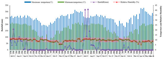 The location falls in the region of the southwest monsoon, and monsoon rains generally start from the end of June and continue up to mid-October, with an average annual rain of 1377 mm. Out of the total annual rain, monsoon rain constitutes about 80–90%. The meteorological information, such as the maximum and minimum temperature (°C), rainfall (mm), and relative humidity (%) during the period of experimentation (July 2014–June 2016), were received from the meteorological observatory of the Institute of Agriculture, Sriniketan, and is presented in Figure 1.