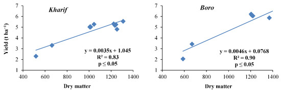 Relation between dry matter and yield of Kharif and Boro rice.