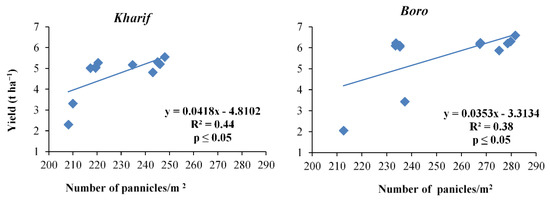 Relation between number of panicles m−2 and yield of Kharif and Boro rice.